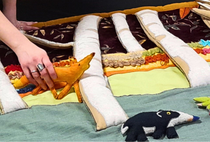 Tapis-paysage molletonné réalisé en tissus colorés, le tapis de lecture sert de fil conducteur à des histoires, comptines, chansons, ballades...